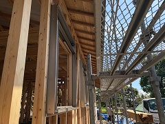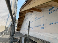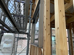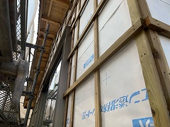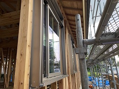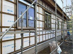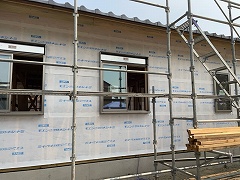 窓台・サッシ枠〜構造金物取付〜防蟻処理〜床 下地+断熱〜透湿防水シート〜外壁:3×10板張り
